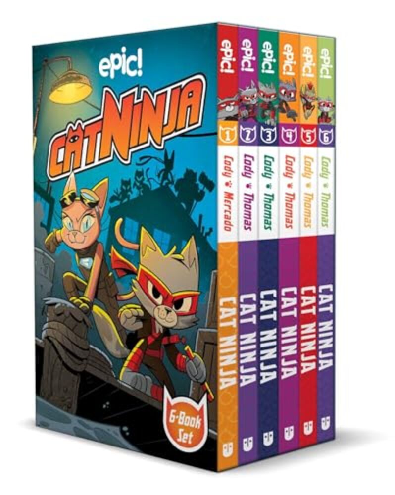 Dive whiskers-first into the bestselling graphic novel series about a new breed of superhero! In this action-packed box set, join Cat Ninja and his friends as he faces a variety of challenges, from scheming villains to babysitting and boredom. Raised from a kitten by a kindly old ninja master, Claude now spends his days as the pampered house cat of an eleven-year-old boy. But when trouble arises, he dons his mask and springs into action as Cat Ninja--Metro City's secret protector! Follow Cat Ninja, Master Hamster, and a colorful cast of friends and foes in this box set containing the full 6-book series! Book 1: Cat Ninja Follow our feline hero's early exploits as he tries to keep his secret identity under wraps while thwarting the evil plans of slimy crooks, rampaging robots, and a certain rodent nemesis who lives under the same roof! Book 2: Time Heist When Leon brings a mystery egg home from school, Cat Ninja and Master Hamster face their biggest challenge yet: babysitting! And while they're pretty sure they can keep an egg out of trouble, they know they're in over their heads when that egg hatches into a high-energy ball of feathers and cuteness. It's baby's first superhero adventure when they decide to bring their newest family member along as they uncover the identity--and nefarious motives--of Metro City's latest foe. Book 3: Wanted Metro City's favorites and newcomers in tales that include a nearly cat-astrophic case of stolen identity, the not-so-villainous adventures of Master Hamster, and Adonis's first mission as one of the good guys. Enjoy six stand-alone stories, plus a five-part Cat Ninja special miniseries! Book 4: Welcome to the 'Burbs When Dad buys a new house outside the city, the kids are less than excited about new neighbors, backyard barbecues, and quiet, tree-lined streets. And they're not alone--a summer in the suburbs is enough to make Cat Ninja miss the villains of Metro City! Our hero and his family feel like fish out of water when they arrive in Peaceful Valley, but it won't be long before Dad's new neighborhood reveals its scaly, golden underbelly. Book 5: Cat's Claw When a notorious band of ninjas discovers a certain Metro City hero wearing their colors and practicing their Kat Fu, their leader sets out to settle an old score. Plus, a nocturnal ninja flaps into town, Octopunch puts up his dukes (all eight of 'em!), Adonis plays hero, Master Hamster's creative kitchen repairs end with a scorching surprise, and our favorite frenemies-against-the-odds compete in the villainous Vroomin' Race! Book 6: Heart of a Hero It's nonstop crime time in Metro City, and the hero the city needs is...Octopunch? Even an eight-armed avenger can't keep the streets safe by himself, though, so Cat Ninja's spending all his time catching crooks--and no time curled up with his family. When he realizes that Leon needs him more than Metro City does, it might be time to hang up the nunchucks. But with a brand-new baddie kidnapping every pest and pet in town, can our hero really afford to cat nap?