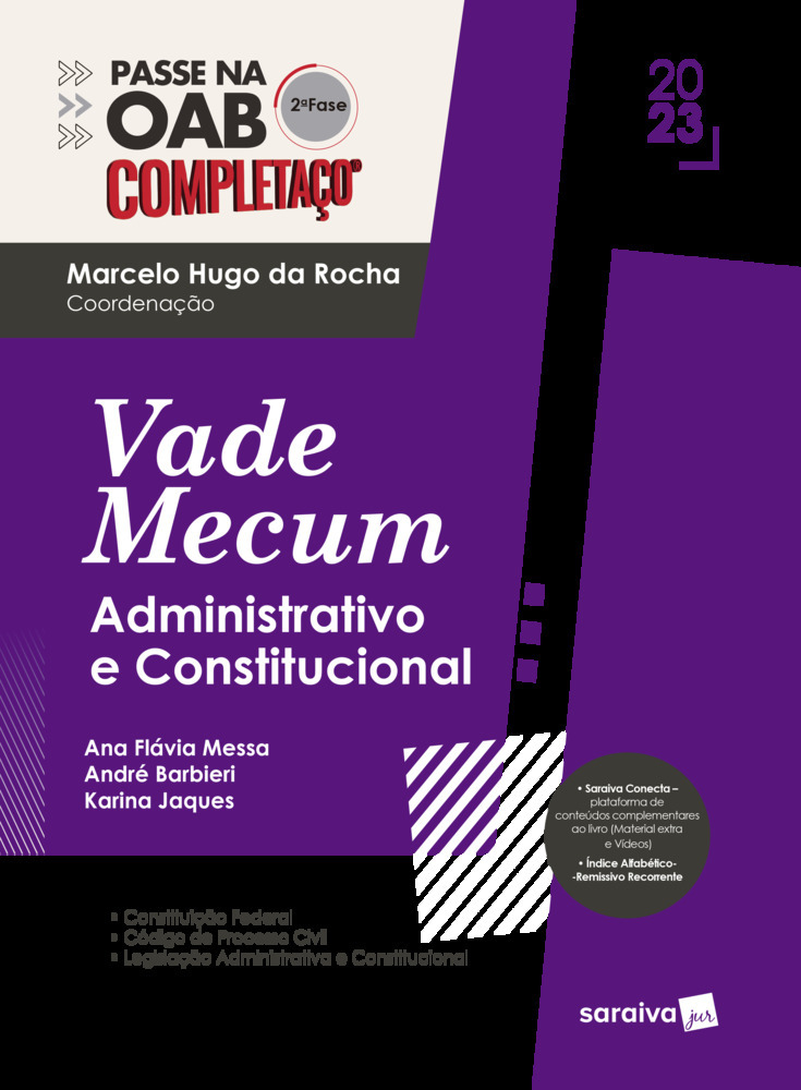 Data de Fechamento da obra: 17-4-2023A serie Passe na OAB 2.º fase – Completaço : Vade Mecum, contempla, em cada volume, as principais áreas de atuação do direito: Administrativo e Constitucional, Civil e Empresarial, Penal, Trabalhista, e Tributário.Elaborada por renomados professores com larga experiência em preparação para o Exame de Ordem.Destacam-se alguns aspectos importantes desta coleção.Apresenta um formato inédito, com tamanho maior, para trazer mais conteúdo por página e facilitar a consulta no dia da prova.A seleção da legislação em cada volume foi feita de acordo com o edital programático e considerando o que de fato tem sido cobrado nas provas, evitando incluir leis totalmente desnecessárias. Incluí o “índice remissivo recorrente” como uma novidade, para agilizar a consulta daqueles artigos essenciais, baseada na sua incidência sem caracterizar estruturação de roteiros de peças processuais.Outro diferencial é o conteúdo digital, que pode ser acessado antes da prova, por meio da plataforma Saraiva Conecta, na qual constam vídeos e material extra para complementar a experiência da série Completaço®.Últimas atualizações:- Constituição Federal(até EC n. 128, de 22-12-2022)- Código de Processo CivilHonorários advocatícios (Lei n. 14.365, de 2-6-2022)Representação Judicial do Município (Lei n. 14.341, de 18-5-2022)Sistema de Registro de Preços (Decreto n. 11.462, de 31-3-2023)Sistema de leilão eletrônico (Decreto n. 11.461, de 31-3-2023)Reserva de cotas para cargos na Administração Pública (Decreto n. 11.443, de 21-3-2023)Contratações públicas (Decreto n. 11.430, de 8-3-2023)Política Nacional de Educação Digital (Lei n. 14.533, de 11-1-2023)Serviços de Ativos Virtuais (Lei n. 14.478, de 21-12-2022)Regras para atuação do agente de contratação no âmbito da administração pública (Decreto n. 11.246, de 27-10-2022)Lei Anticorrupção – Regulamento (Decreto n. 11.129, de 11-7-2022)Programa Internet Brasil (Lei n. 14.351, de 25-5-2022)